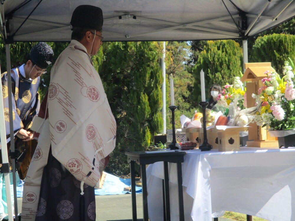 春にしては眩しい日差しの中、熊野神社様の祝詞をもって神式合同供養祭を執り行いました。